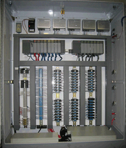 We supply fully wired and tested control panels. Our control panels are UL listed, and if required, CE certified. All control panels are shipped with a complete set of electrical schematics. We install our control panels in a variety of environmental conditions, and have a great deal of experience with Nema 4X enclosures intended for the food and beverage industry. Panel design voltages range from 24 VDC to 480 VAC. Typical panel designs include PLC components, motor controls, graphical user interfaces, servos, RTUs, pnuematic devices and termination. All panels are built according to NEC and NFPA guidelines. |